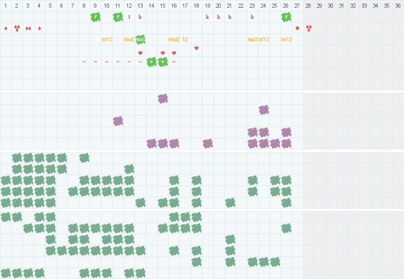 | 22pn | 23wt | 24śr | 25cz | 26pt | 27so | 28nd | 01pn | 02wt | 03śr | 04cz | 05pt | 06so | 07nd | 08pn | 09wt | 10śr | 11cz | 12pt | 13so | 14nd | 15pn | 16wt | 17śr | 18cz | 19pt | 20so | 21nd | 22pn | 23wt | 24śr | 25cz | 26pt | 27so | 28nd | 29pn |